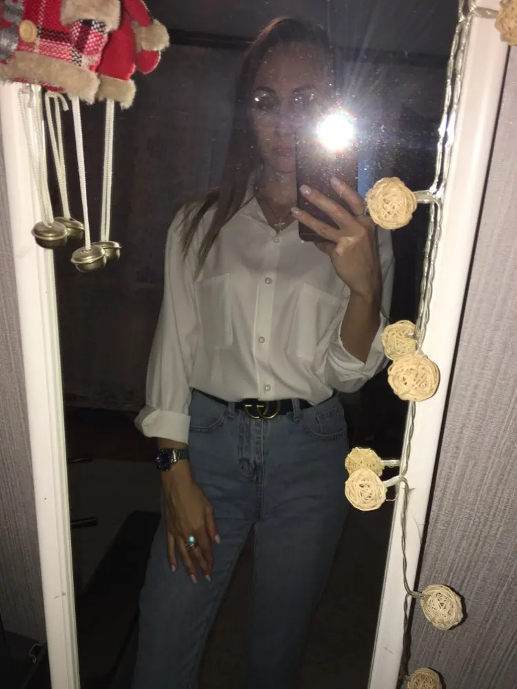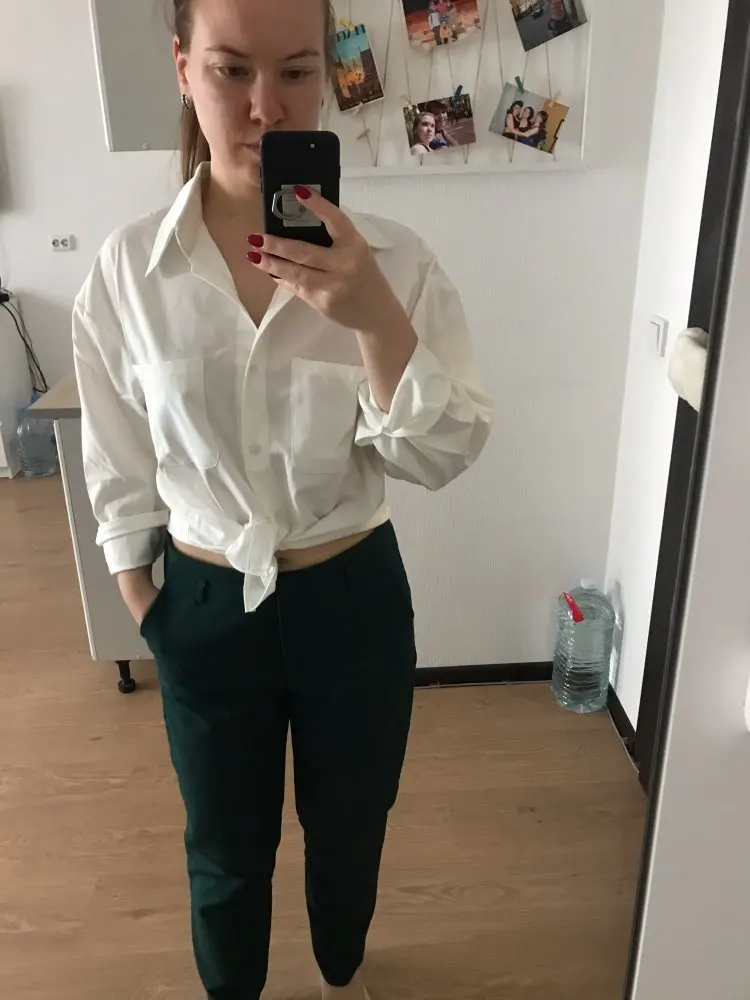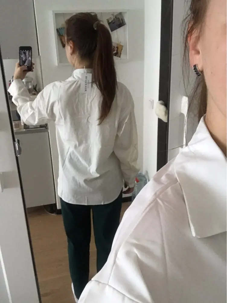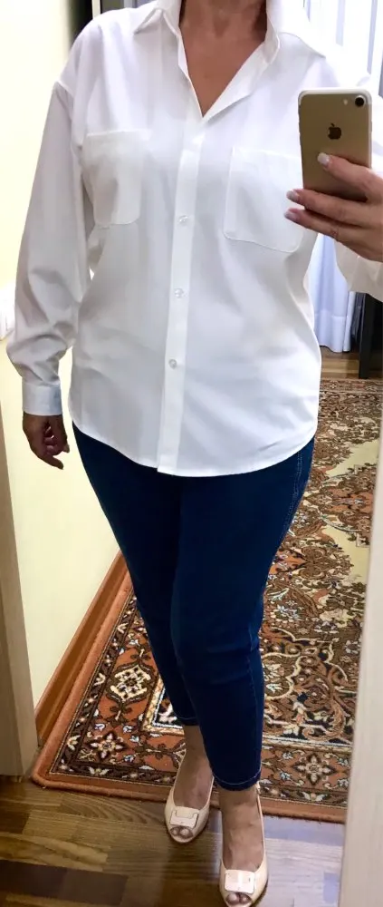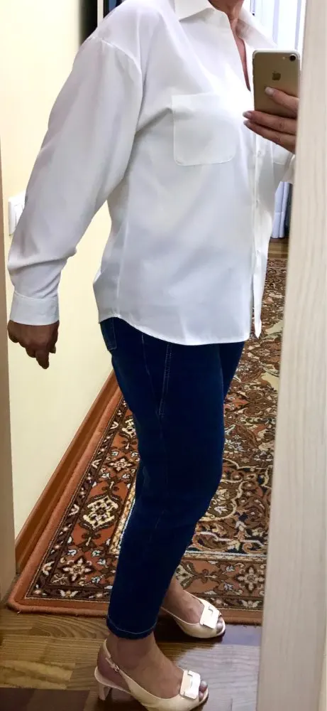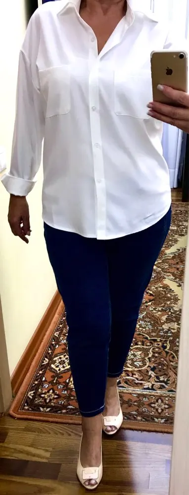Amazing shirt. On the parameters (chest 81, waist 60) ordered the size M, so that he sat like an oversize. That's how it came. The shirt is exactly what I wanted. It doesn't crumple. Does not shine through (in the photo under the shirt dark underwear). I like that you can combine with different clothes and wear differently. I'm happy! The parcel reached Yekaterinburg in 19 days, the track was tracked, the store answered all questions. Even more reviews from me in Instagram @ etalonstyle