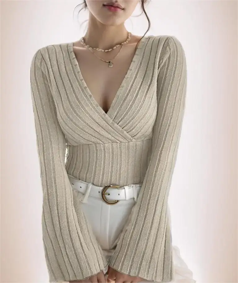 Y2k Ribbed Striped Knit Wrap Sweater Long Sleeve Flared Cuff Top OUT1052