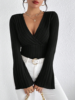 Y2k Ribbed Striped Knit Wrap Sweater Long Sleeve Flared Cuff Top OUT1052