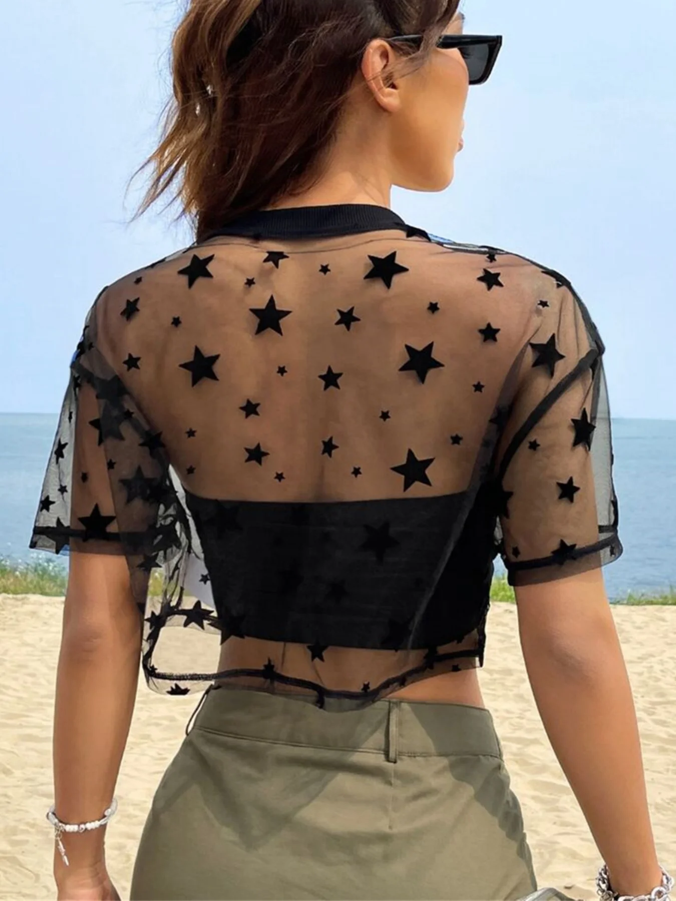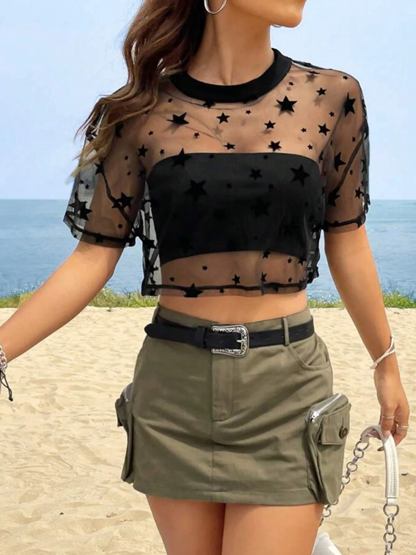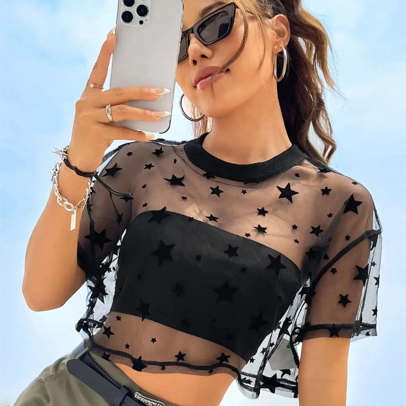 Y2K Star Print Sheer Mesh Crop Top Women Short Sleeve Slim Fit Tee for Summer Streetwear OUT1064